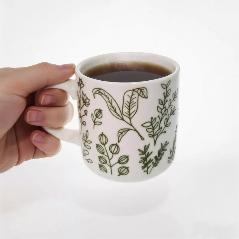 1. Бұл кружкада визуалды орталық ретінде қарапайым және табиғи жасыл ботаникалық баспа бар: