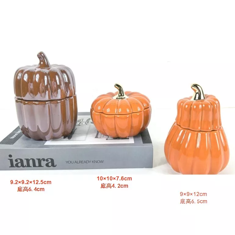 Хэллоуинді асқабақ керамикалық әшекейлері: Банкалар асқабақтың табиғи реңктерін репликациялау үшін нақты және көркемдік безендірілген. Банкалар қара қоңыр және ашық-қызғылт сары түске кіріп, асқабақтың табиғи түсіне әсер етеді және тазартылған және көзді ұстайтын қабатқа арналған металл қақпағы мен тұтқасы бар.
