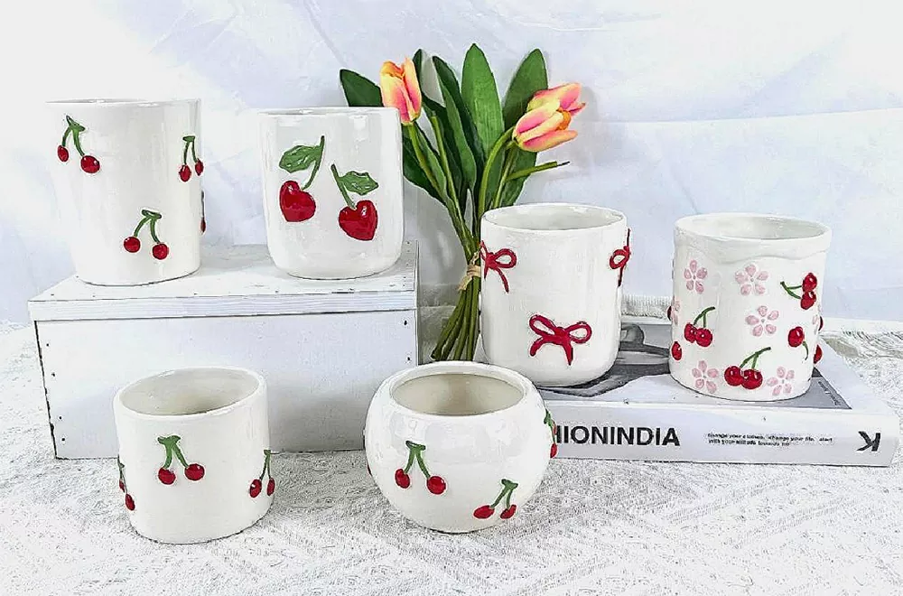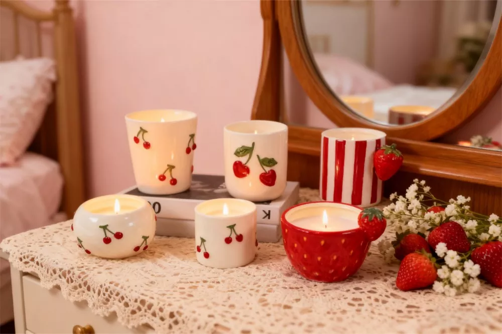 Жарқын қызыл шие және жасыл жапырақ мотив классикалық және қуанышты тәтті атмосфераны жеткізеді. Ерекше, үш өлшемді құлпынай тәрізді тұтқасы және банка дизайны клиенттерге итермелейтін, өздігінен ниет білдіре отырып, жағымсыз сезімді қосады. Талғампаз қызыл немесе қызғылт көбелек түйіндер дизайнды безендіреді, өнімді тазартылған сыйлық сапасы мен романтикалық стиль береді. Жоғары сапалы қолмен жасалған керамикадан жасалған, глазуры жылтыр және тегіс, тегіс, тегіс, күңгірт құрылымды ерекшелейді. Ол өте жақсы ыстыққа төзімділік пен тұрақтылыққа ие, қауіпсіз жануды қамтамасыз етеді және соя балауызы және ара балауызы сияқты жалпы балауыз негіздерімен тамаша үйлеседі.