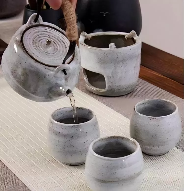 Бұл дәстүрлі шай жиынтығында шайнек және үш шай бар, сонымен қатар кастрюльді жылы ұстау үшін керамикалық тіреуі бар.